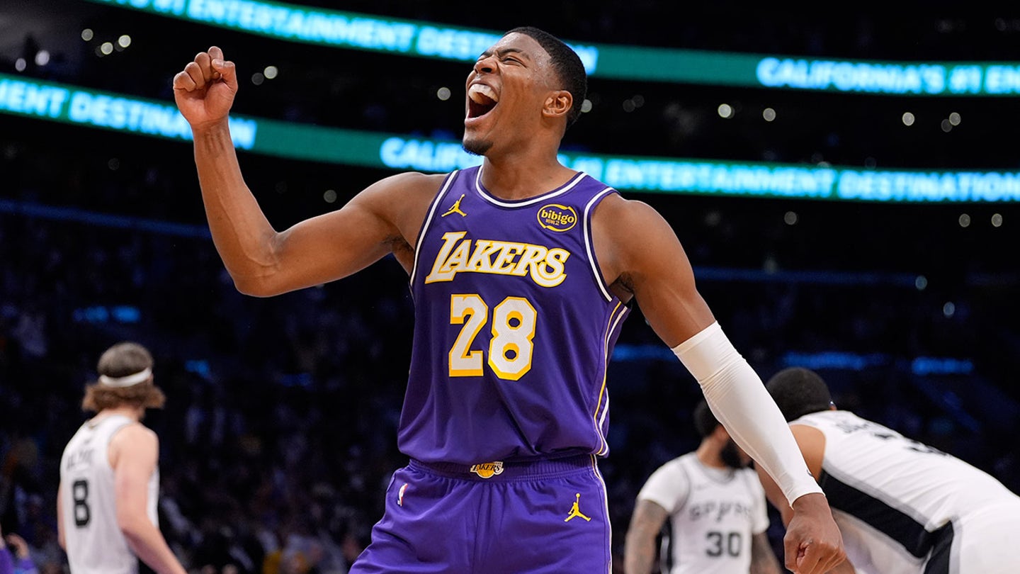 Los Angeles Lakers forward Rui Hachimura celebrates after San Antonio Spurs forward Julian Champagnie missed a free throw with the Lakers up by two points and under one second on the clock during the second half of an NBA basketball game Wednesday, Nov. 5, 2025, in Los Angeles. (AP Photo/Mark J. Terrill)