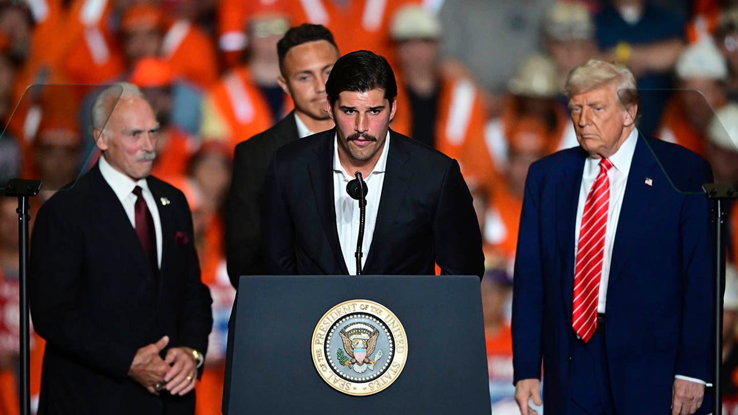 Pittsburgh Steelers Quarterback Mason Rudolph, Center, speaks like former Pittsburgh Steelers player Rocky Bleier, Left, Pittsburgh Steelers Safety Miles Killebrew and President Donald Trump, right, listen to US Steel Mon Valley Worksirvin Plant Friday, May 30, 2025 in West Miffflin, Pennsylvania. (AP Photo/David Dermer)
