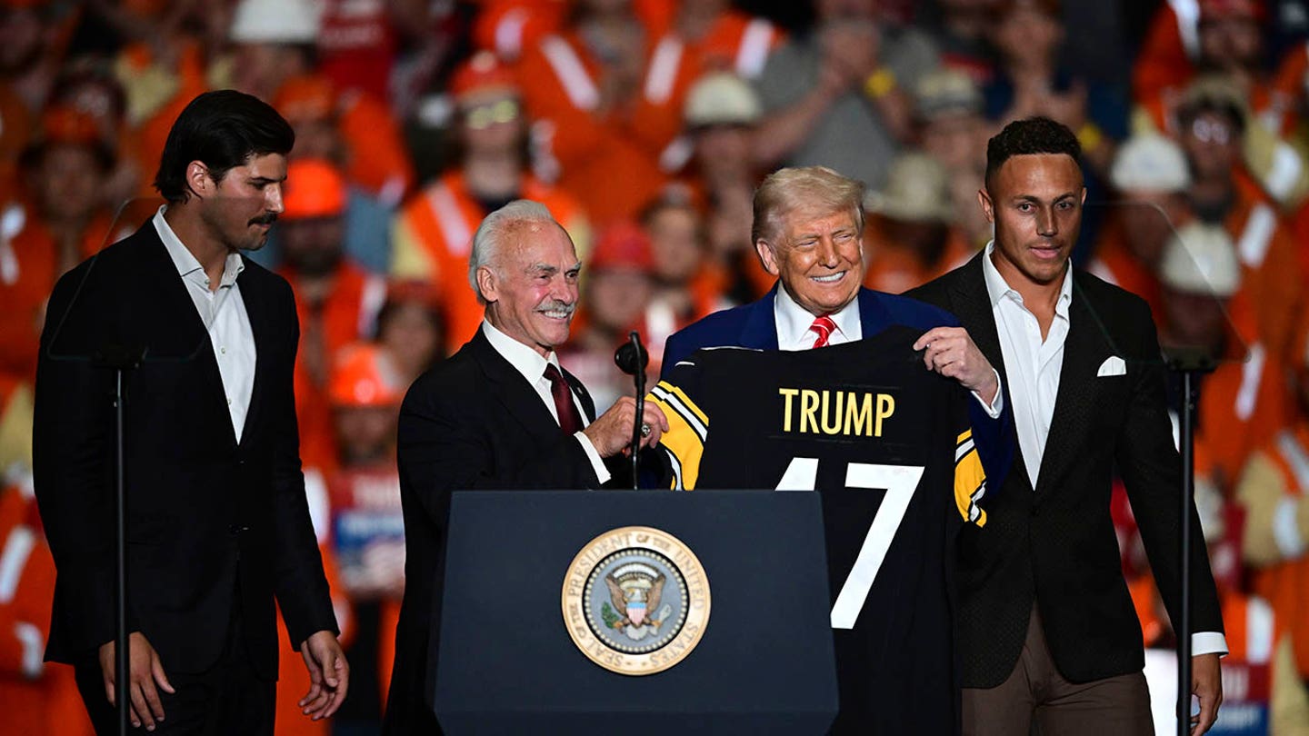 Steelers Quarterback Mason Rudolph, Safety Miles Killebrew and earlier ran back Rocky Bleier, who won four Super Bowls in Pittsburgh in the 1970s, took the stage and presented the president of a custom No. 47 jersey.