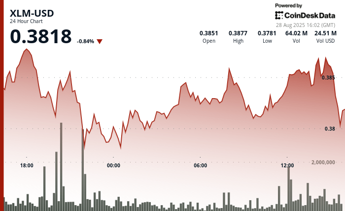 Stellar’s native token, lumen (XLM)showed sharp intraday ductility over the last 24 hours, with prices swung between $ 0.38 and $ 0.39 – a 3% turn. After sliding from $ 0.39 to $ 0.38 in the evening of August 27, XLM found fixed support at the lower border where trade volumes rose over the daily average of 25.4 million.