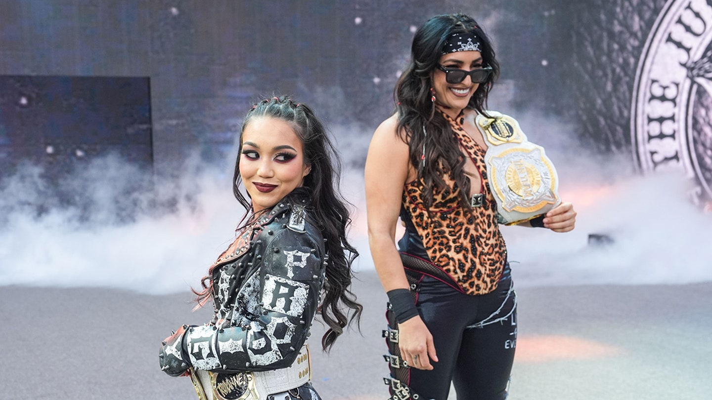 Roxanne Perez and Raquel Rodriguez make their entrance during smackdown at the Prudential Center 2 August 2025, in Newark, NJ (Craig Melvin/WWE via Getty Images)