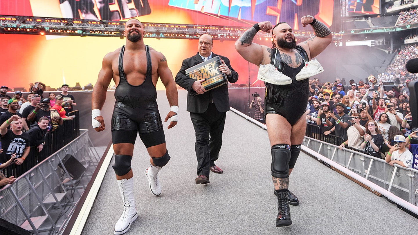 Bron Breaker, Paul Heyman and Bronson Reed make their entrance under Summerslam at Metlife Stadium August 2, 2025 in East Rutherford, NJ (Craig Melvin/WWE via Getty Images)
