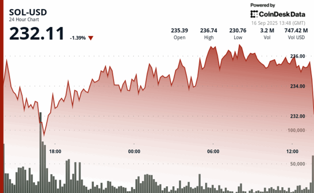The latest 24-hour Coindesk data card, which ends at 1 p.m. 12:30 ADC on September 16th, Sol will show $ 232.11 after withdrew from a $ 236- $ 237 intraday zone. Trade narrowed into the $ 232- $ 234 band, which reinforces this area as short-term support.