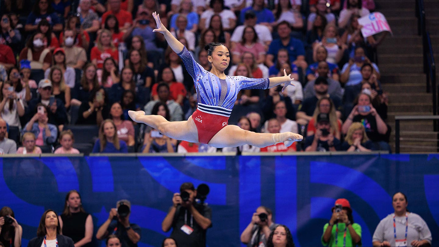 Suni Lee competes in the floor exercise during the women’s American Olympic Gymnastics attempt on June 30, 2024 in Minneapolis. (Nikolas Liepins/Anadolu via Getty Images)