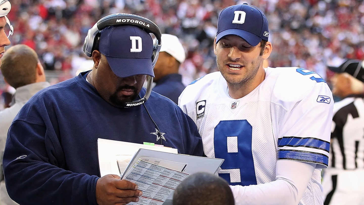 Quarterback Tony Romo (9) from Dallas Cowboys speaks with running backs coach Skip Peete on the sidelines during the game against Arizona Cardinals at the University of Phoenix Stadium in Glendale, Arizona, on December 4, 2011. The cardinals defeated cowboys 19-13 in overtime. (Christian Petersen/Getty Images)