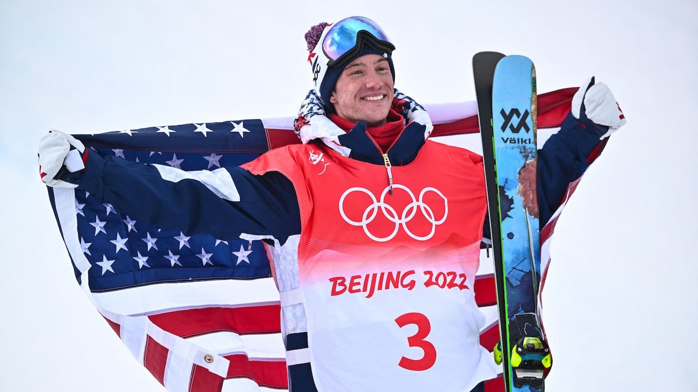 Bronze medal Alex Ferreira from the United States, with its national flag on the podium after freestyle -skiing, constitutes the Freeski Halvpipe last race during Beijing 2022 Winter -Olympic Games at Genting Snow Park H&S Stadium in Zhangjiakou February 19, 2022. (Marco Bertorello/AFP via Getty Images)