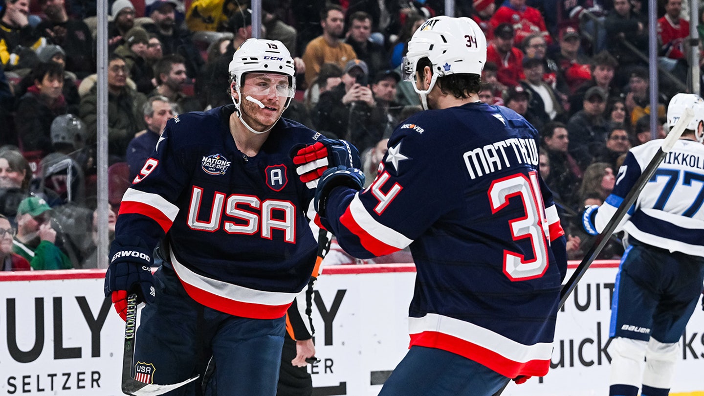 Team USA Forward Matthew Tkachuk (19) celebrates with Team USA tip Auston Matthews (34) his goal against Team Finland in the third period during a 4 Nations Face-off Ice Hockey Game at the Bell Center. (David Kirouac-Preferred Pictures)