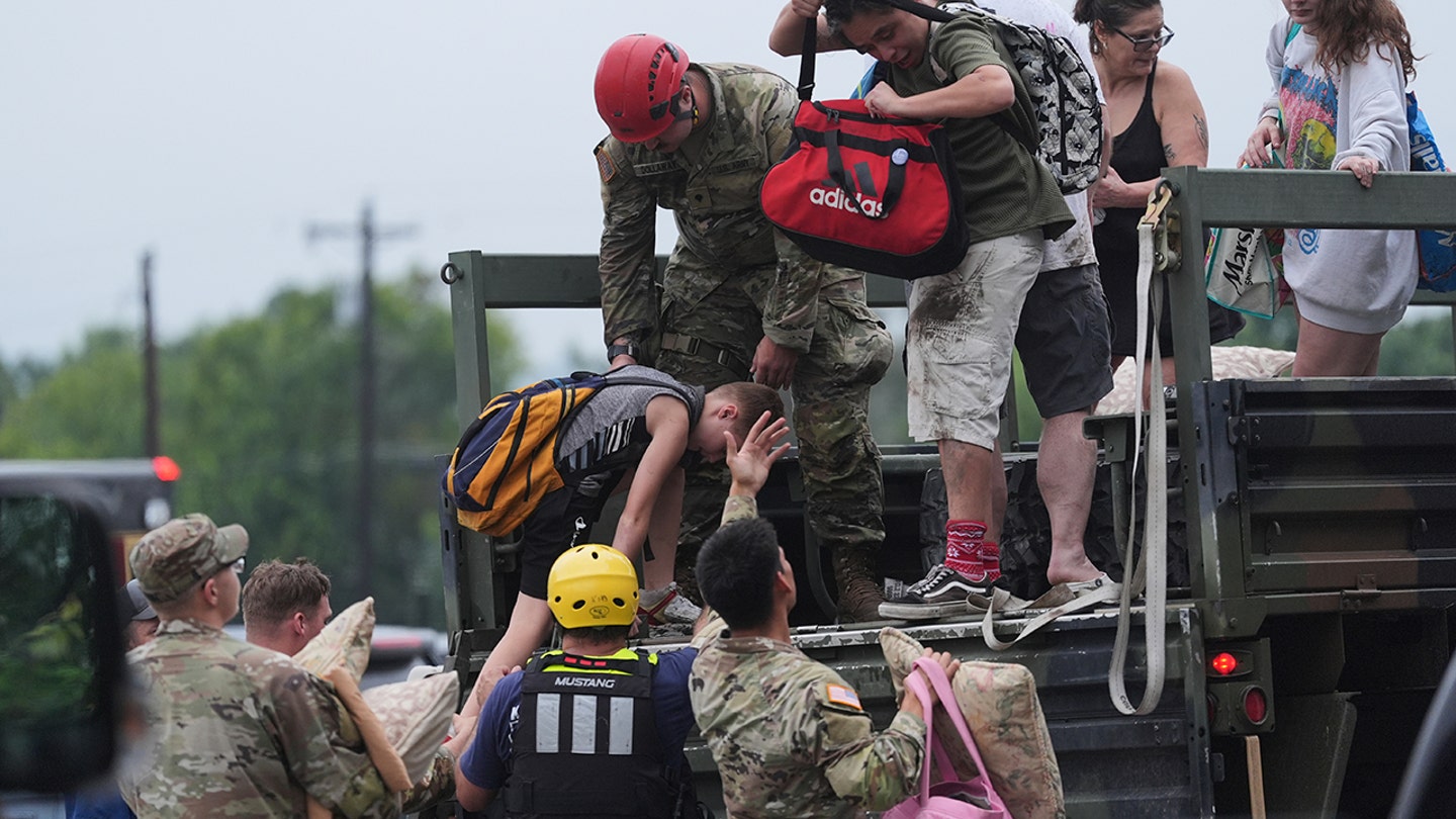 The first respondents deliver people to a reunion center after flash flooding in the area Friday 4. July 2025 in Ingram, Texas. (AP Photo/Eric Gay)