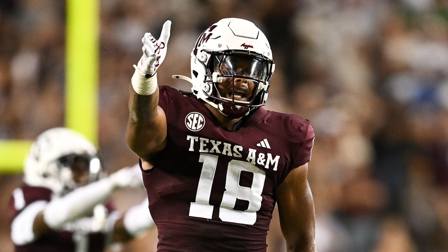 Texas A&M Aggies Defensive Lineman Cashius Howell (18) responds during a game against Notre Dame fighting Irish at Kyle Field on August 31, 2024 in College Station, Texas. (Maria Lysaker/USA Today Sports)