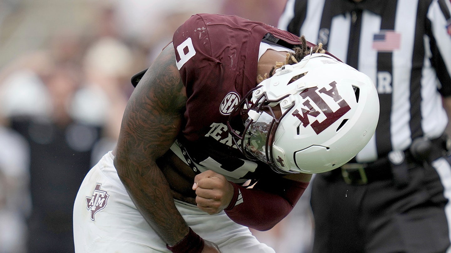 Texas A&M Defensive End Cashius Howell (9) responds after firing Utah State Quarterback Bryson Barnes (16) during the second quarter of a college -football match on September 6, 2025 in College Station, Texas. (AP Photo/Sam Craft)