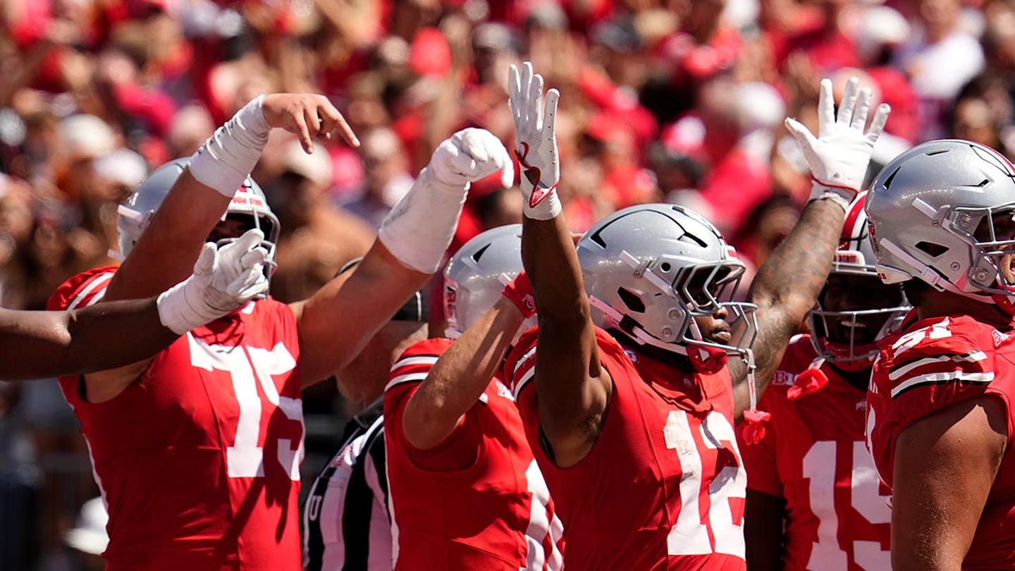 Ohio State Buckeyes, who runs back CJ Donaldson (12), celebrates a touchdown during the first half of the NCAA football match against Texas Longhorns at Ohio Stadium on August 30, 2025. (Adam Cairns / Columbus Dispatch / USA Today Network via Imag images)