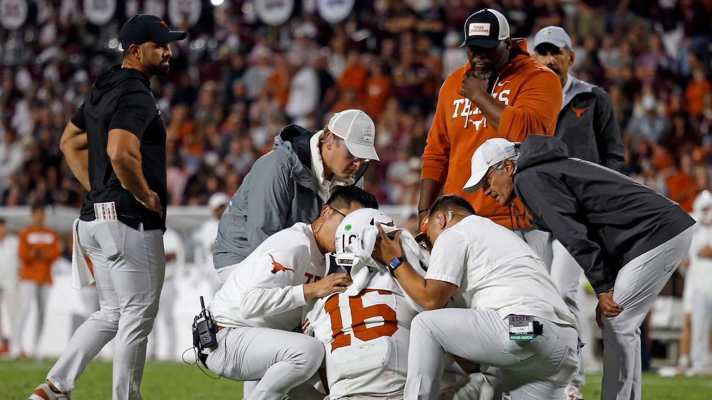 Medical personnel check on Texas Longhorns quarterback Arch Manning (16) during overtime against the Mississippi State Bulldogs at Davis Wade Stadium at Scott Field. (Petre Thomas/Imagn Images)