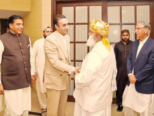 Earlier in the day, a PPP delegation led by Chairman Bilawal Bhutto Zardari – and comprising former Prime Minister Raja Pervez Ashraf, Nayyar Hussain Bukhari and PPP Kashmir President Chaudhry Yasin – arrived at Maulana Fazlur Rehman’s residence. The JUI-F chief was accompanied by his son, Maulana Asadur Rehman.