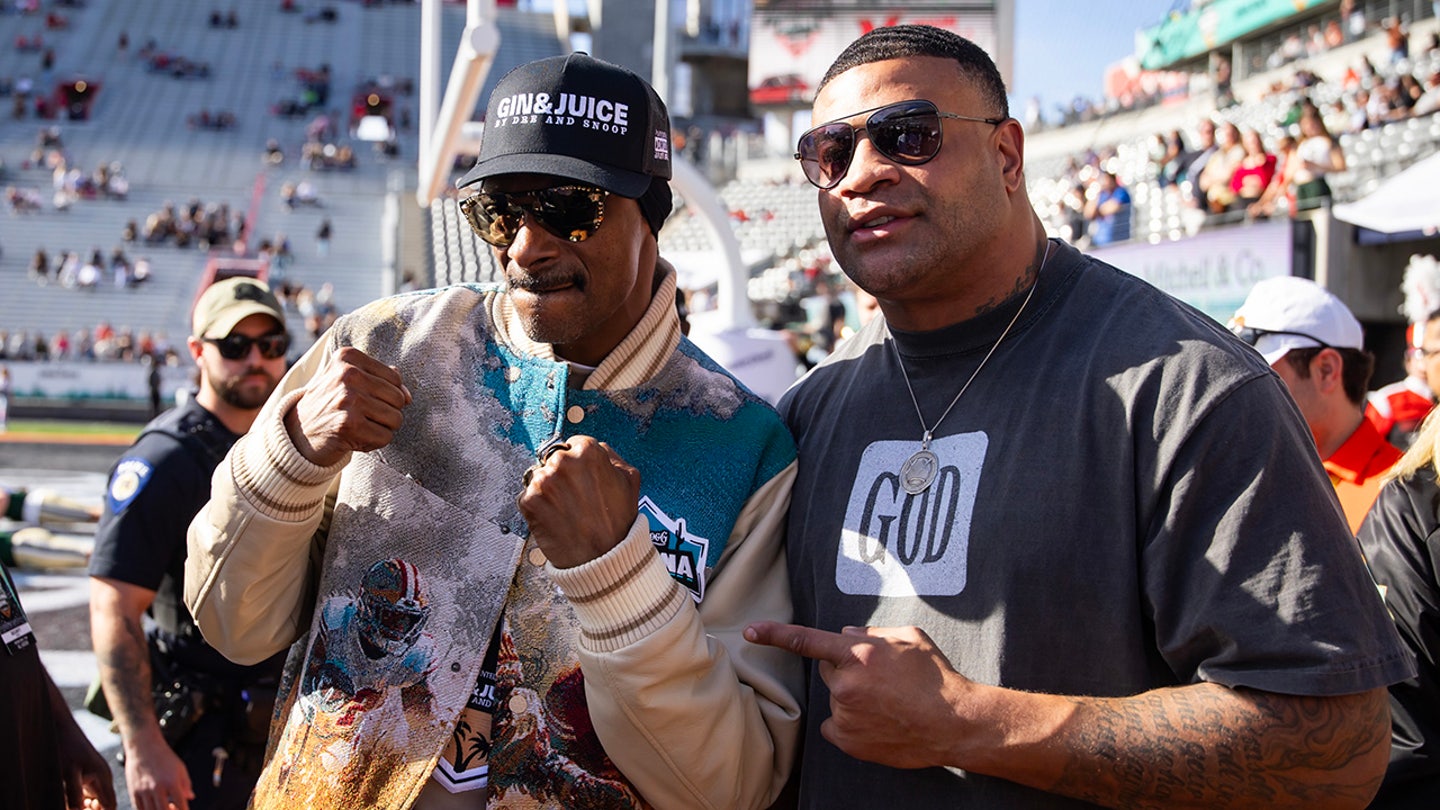 Rapper Snoop Dogg (left) with Shawne Merriman under the Colorado State Rams game against Miami (OH) Redhawks in Snoop Dogg Arizona Bowl at Arizona Stadium on December 28, 2024. (Mark J. Refilas/Imag images)