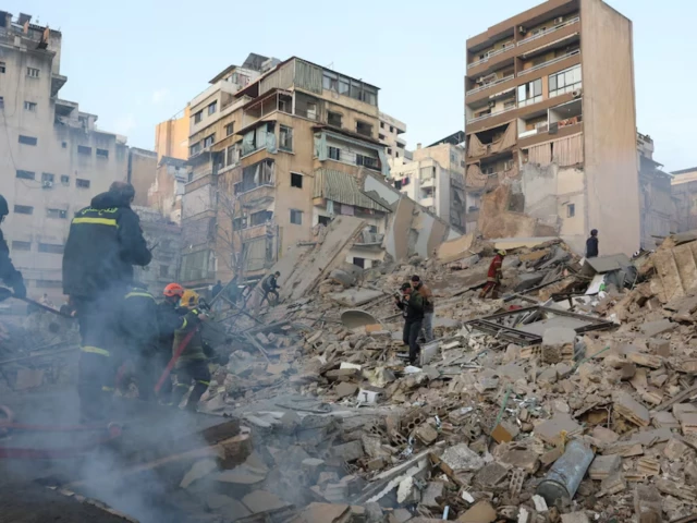 Emergency personnel work at the site of a collapsed building in the wake of an Israeli attack in central Beirut’s Bachoura neighborhood, following an escalation between Hezbollah and Israel amid the US-Israel conflict with Iran, Lebanon March 18, 2026 PHOTO: REUTERS