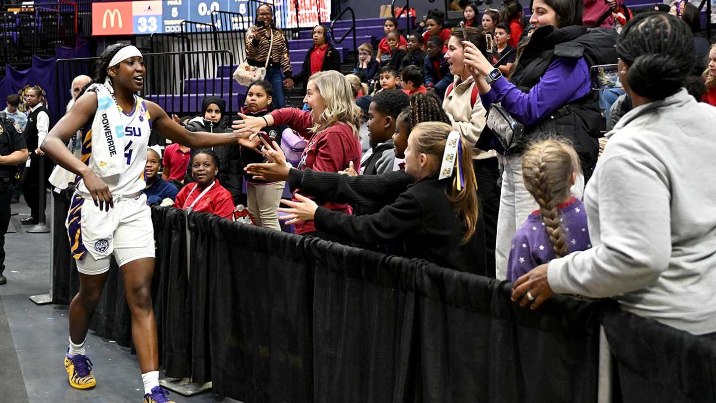 LSU guard Flau’Jae Johnson (4) greets kids from the Louisiana schools’ 2025 Field Trip Day after an NCAA college basketball game against Morgan State in Baton Rouge, Louisiana on Dec. 16, 2025. (AP Photo/Ella Hall)