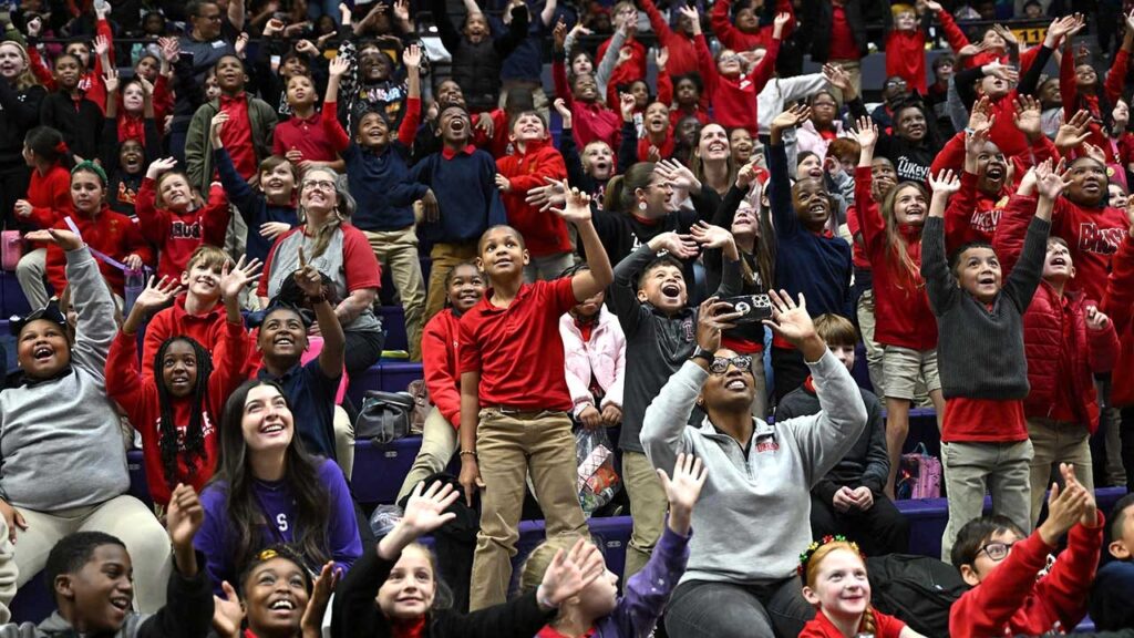 Children from the Louisiana Schools 2025 Field Trip Day celebrate after LSU scored 67 points during an NCAA college basketball game against Morgan State in Baton Rouge, Louisiana on Dec. 16, 2025. (AP Photo/Ella Hall)