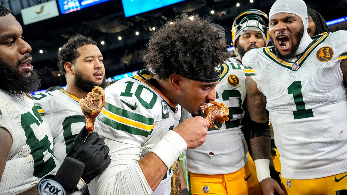 Jordan Love #10 of the Green Bay Packers takes a bite of a turkey leg after the game against the Detroit Lions at Ford Field on November 27, 2025 in Detroit, Michigan. (Nic Antaya/Getty Images)
