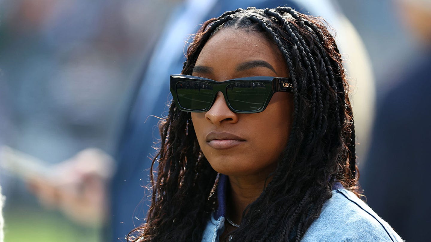 US Gymnast Simone Biles sees practice before the game between Minnesota Vikings and Chicago Bears at Soldier Field, November 24, 2024. (Mike Dinovo-stated images)