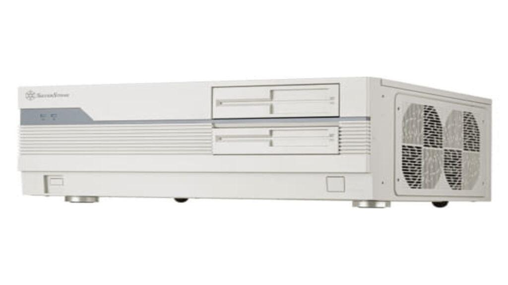 The Japanese device is located in Silverstone’s FLP01 case, designed according to the classic PC-9801 from the 1980s, and has characteristic styling, including a fake 5.25-inch bay cover and mock indicator light.
