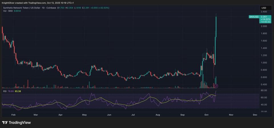 Synthetix’s native token SNX jumped more than 120% over the last 24 hours, according to Coindesk -Market Data, where he was not seen since the 2022 market crash and triggered a new conversation about the earliest “Dino Coins.”