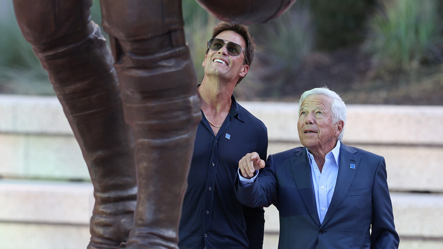 Retired New England Patriots Hall of Famer Tom Brady stands with Robert Kraft during a statue disclosure before a game against the Washington commanders at Gillette Stadium in Foxborough, Mass., August 8, 2025. (Paul Rutherford/Imag- Pictures)