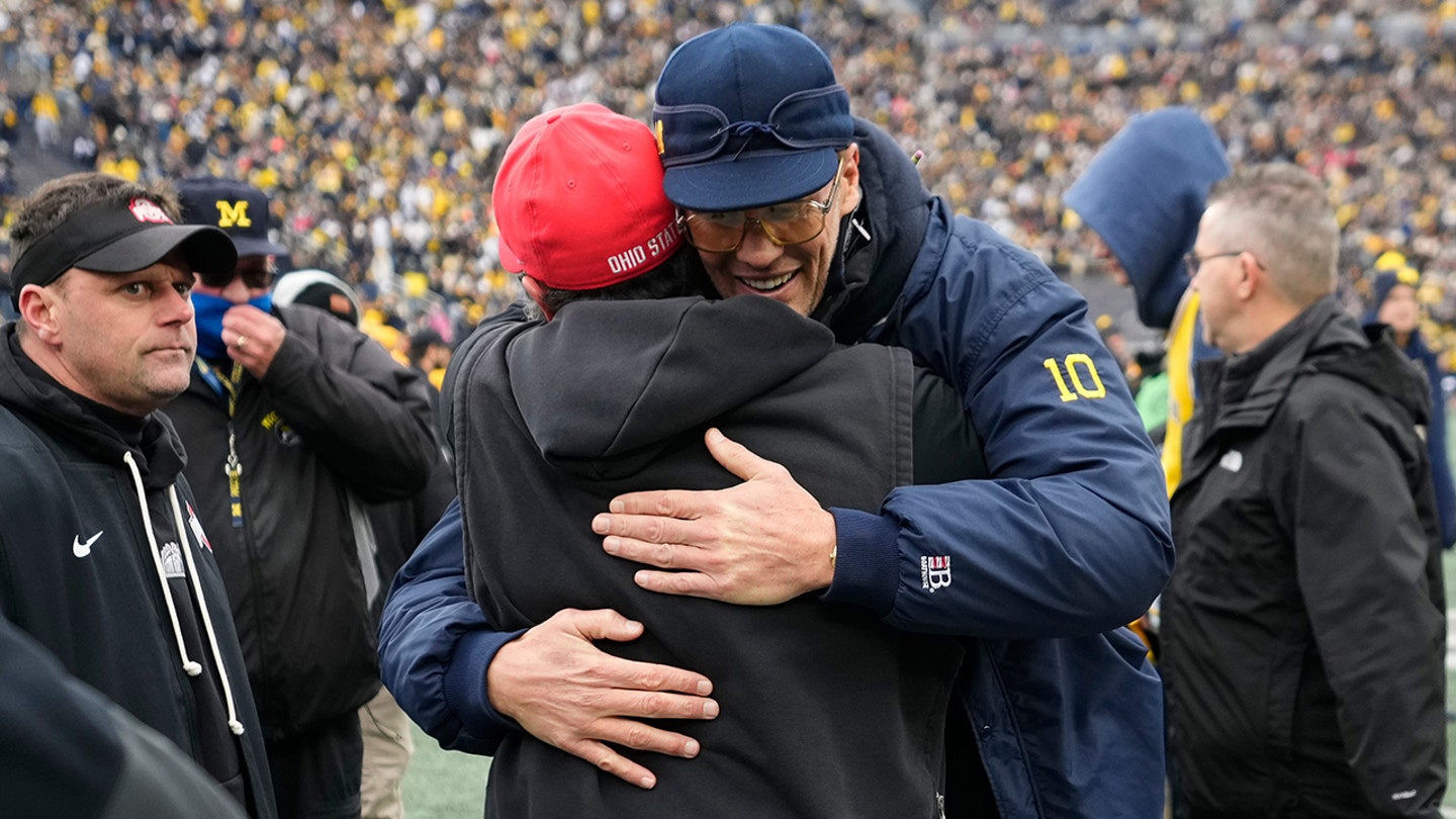 Ohio State Buckeyes defensive coordinator Matt Patricia hugs Tom Brady prior to the NCAA football game against the Michigan Wolverines at Michigan Stadium in Ann Arbor, Mich. on 29 November 2025. (IMAGIN)