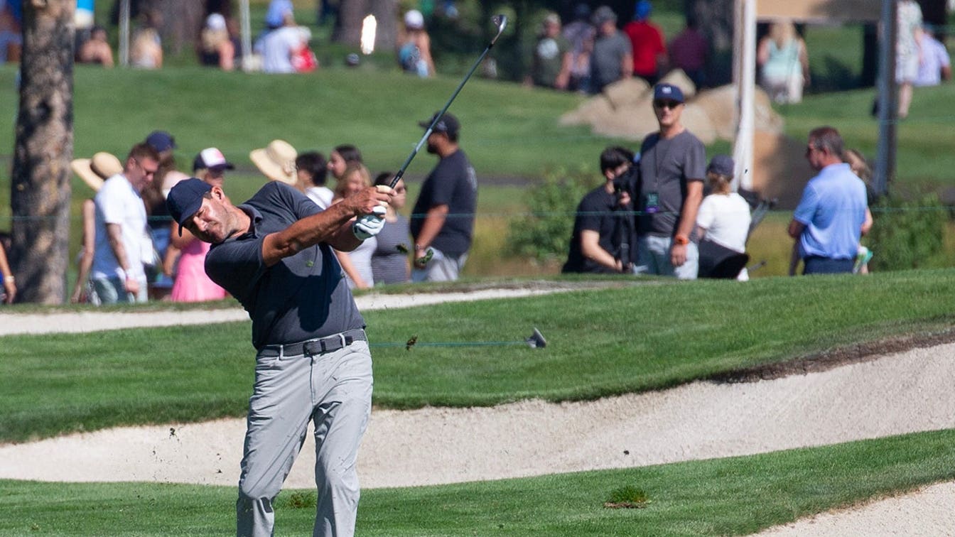 Tony Romo plays his shot from the second tee box during the final round of the American Century Championship at Edgewood Tahoe Golf Course in Stateline, Nevada on July 13, 2025. (Eakin Howard/Getty Images)