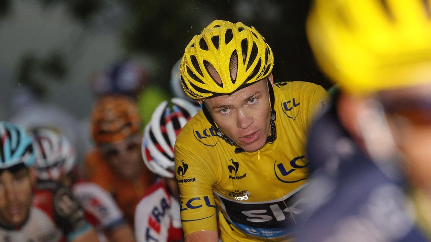 The overall leader’s yellow Jersey Britain’s Christopher Froome runs in heavy rain during the 204.5 km nineteenth phase of the 100th edition of the Tour de France Cycling Race on July 19, 2013, between Bourg-D’oisans and Le Grandand, French Alps. (Joel Saget/AFP via Getty Images)