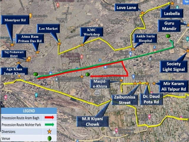 Two major processions differ from Memon Masjid in the afternoon. The first procession will leave at. 14:30 and ends in Aram Bagh Masjid. The second procession begins at 1 p.m. 15 and ends at Nishtar Park.