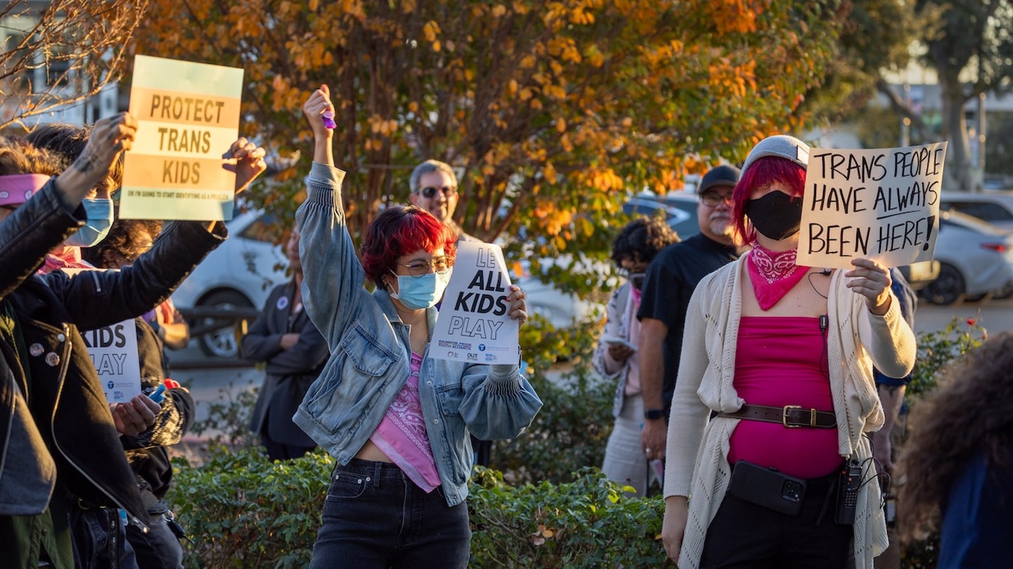 Supporters of transgender athletes hold up signs as an overflow crowd gathers outside the Riverside Unified School District meeting Thursday night to debate the rights of transgender athletes to compete in high school sports Thursday, Dec. 19, 2024. (Allen J. Schaben/Los Angeles Times via Getty Images)