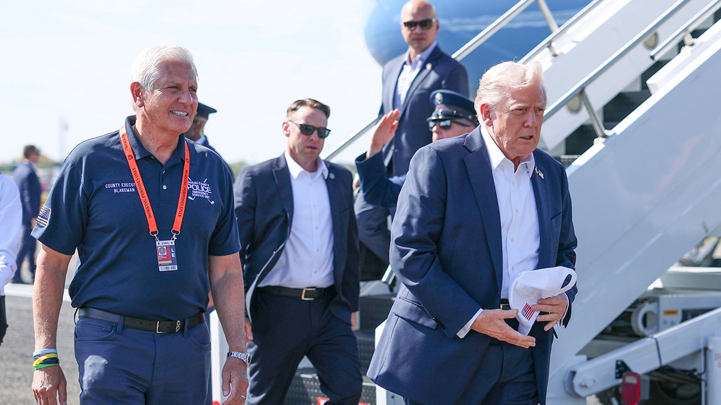 US President Donald Trump joins Bruce Blakeman, County Director of Nassau County, New York, after arriving at Republic Airport at Air Force One on September 26, 2025 in Farmingdale, New York. (Anna Moneymaker/Getty Images)