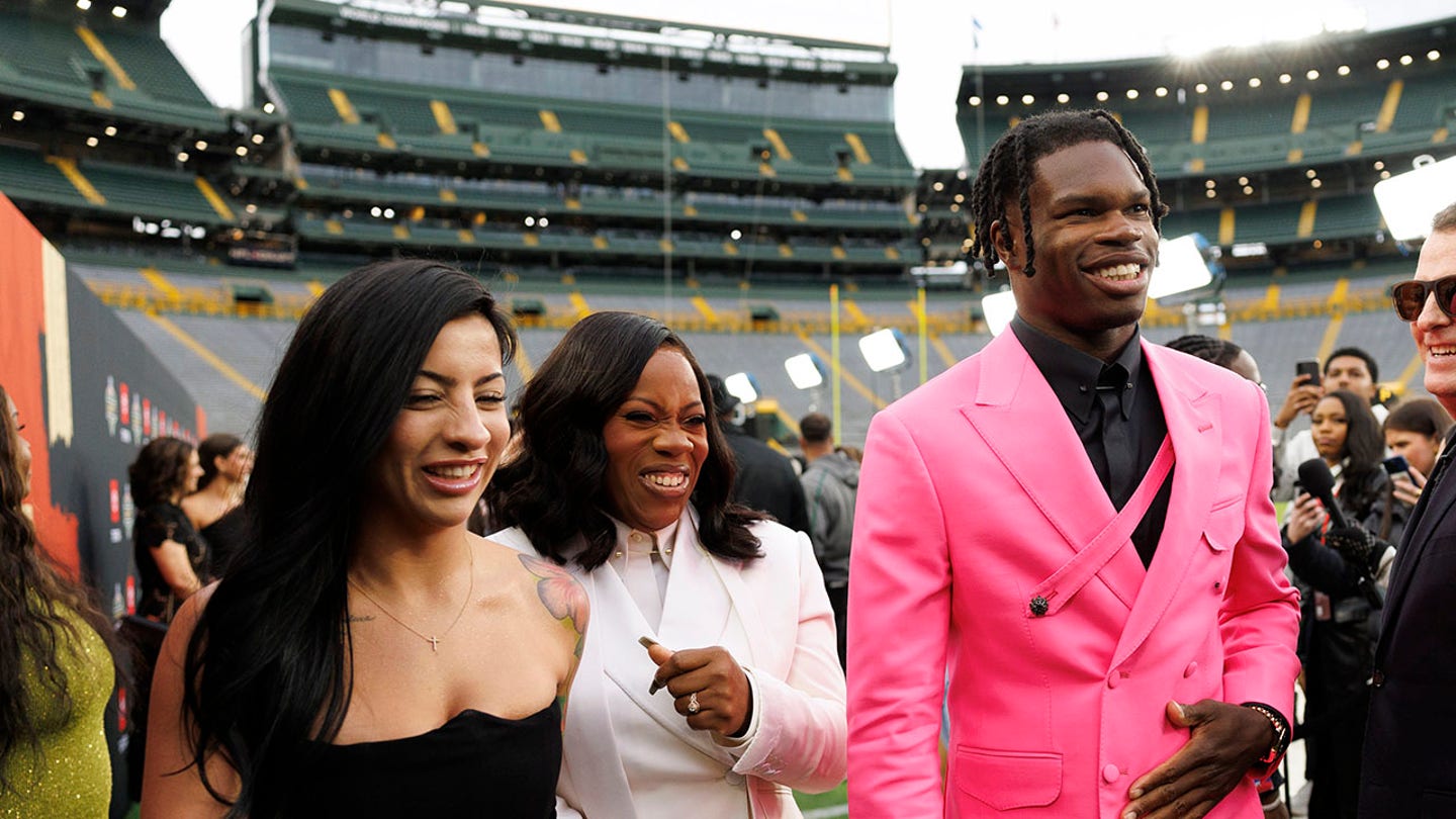 Travis Hunterand Leanna Lenee goes on the red carpet before the first round of the 2025 NFL draft on April 24, 2025 in Green Bay, Wisconsin. (Logan Bowles/Getty Images)