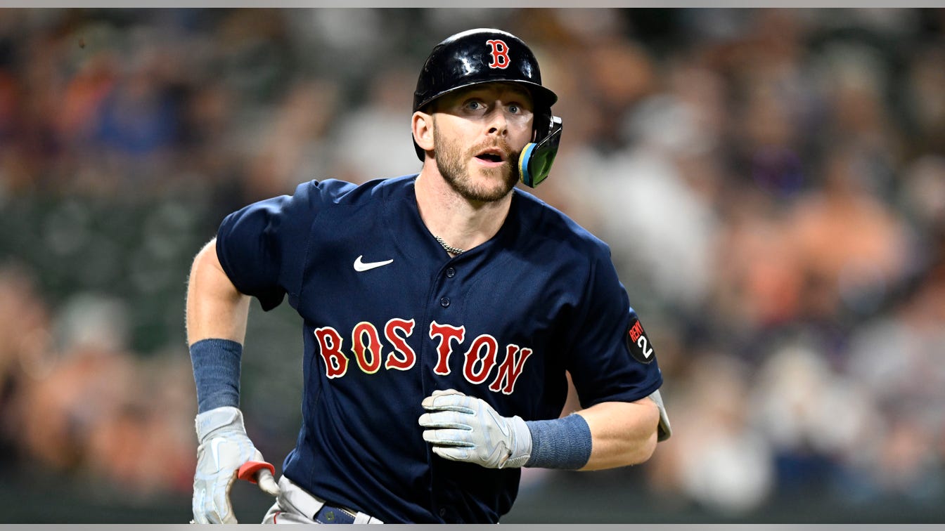 Trevor Story of the Boston Red Sox runs to first base against the Baltimore Orioles at Oriole Park at Camden Yards in Baltimore, Maryland on September 10, 2022. (G Fiume/Getty Images)