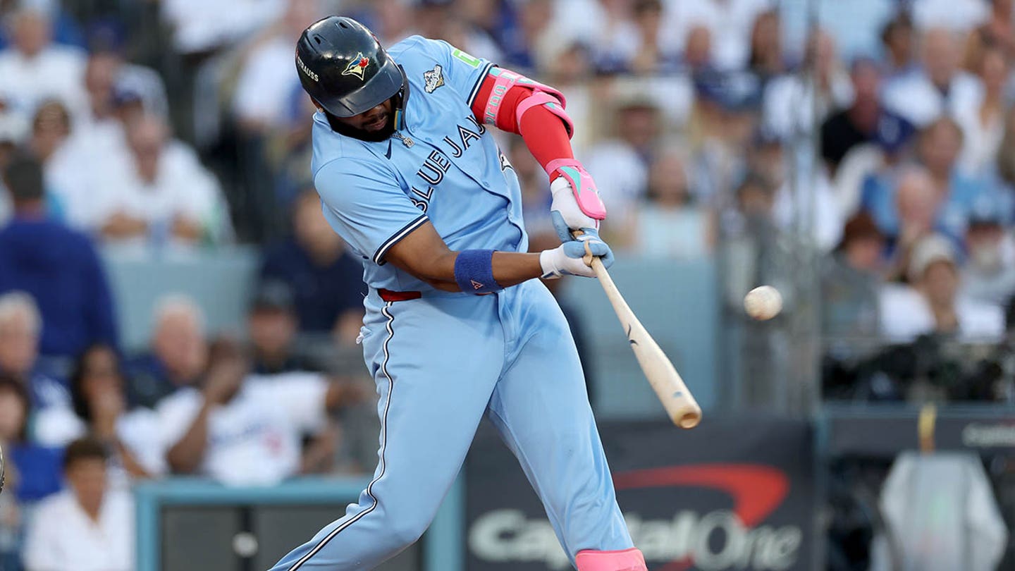 Vladimir Guerrero Jr. of the Toronto Blue Jays hits a home run against the Los Angeles Dodgers during the first inning of Game Five of the 2025 World Series at Dodger Stadium on October 29, 2025 in Los Angeles, California. (Luke Hales/Getty Images)