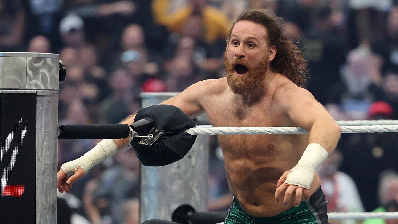 Sami Zayn reacts during the United States Championship match against Trick Williams at WrestleMania 42 at Allegiant Stadium in Las Vegas, Nev., on April 19, 2026. (Ethan Miller/Getty Images)