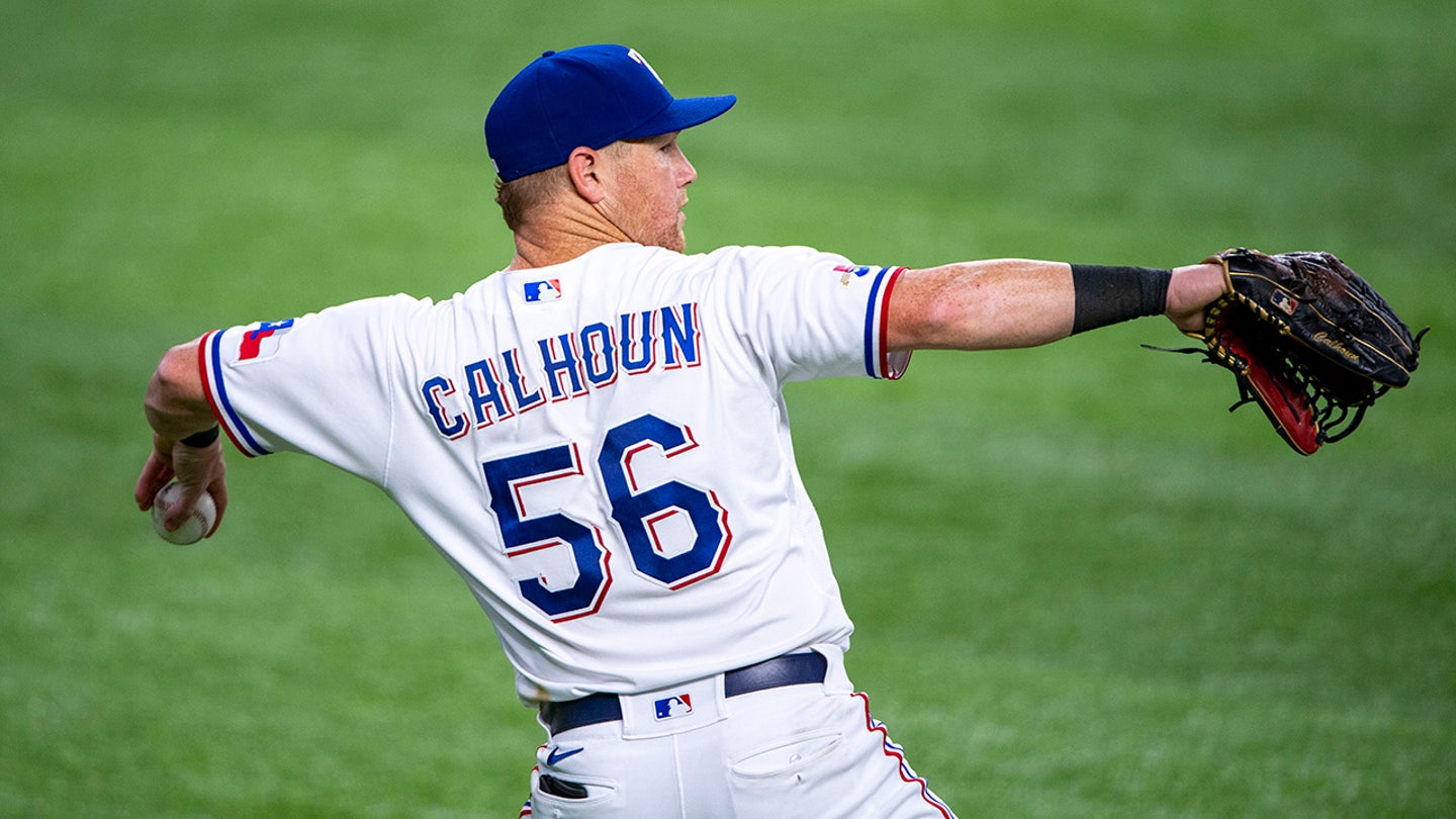 Texas Rangers left fielder Kole Calhoun (56) throws the ball into the infield during the sixth inning against the Seattle Mariners at Globe Life Field on July 16, 2022. (Jerome Miron/USA TODAY Sports)