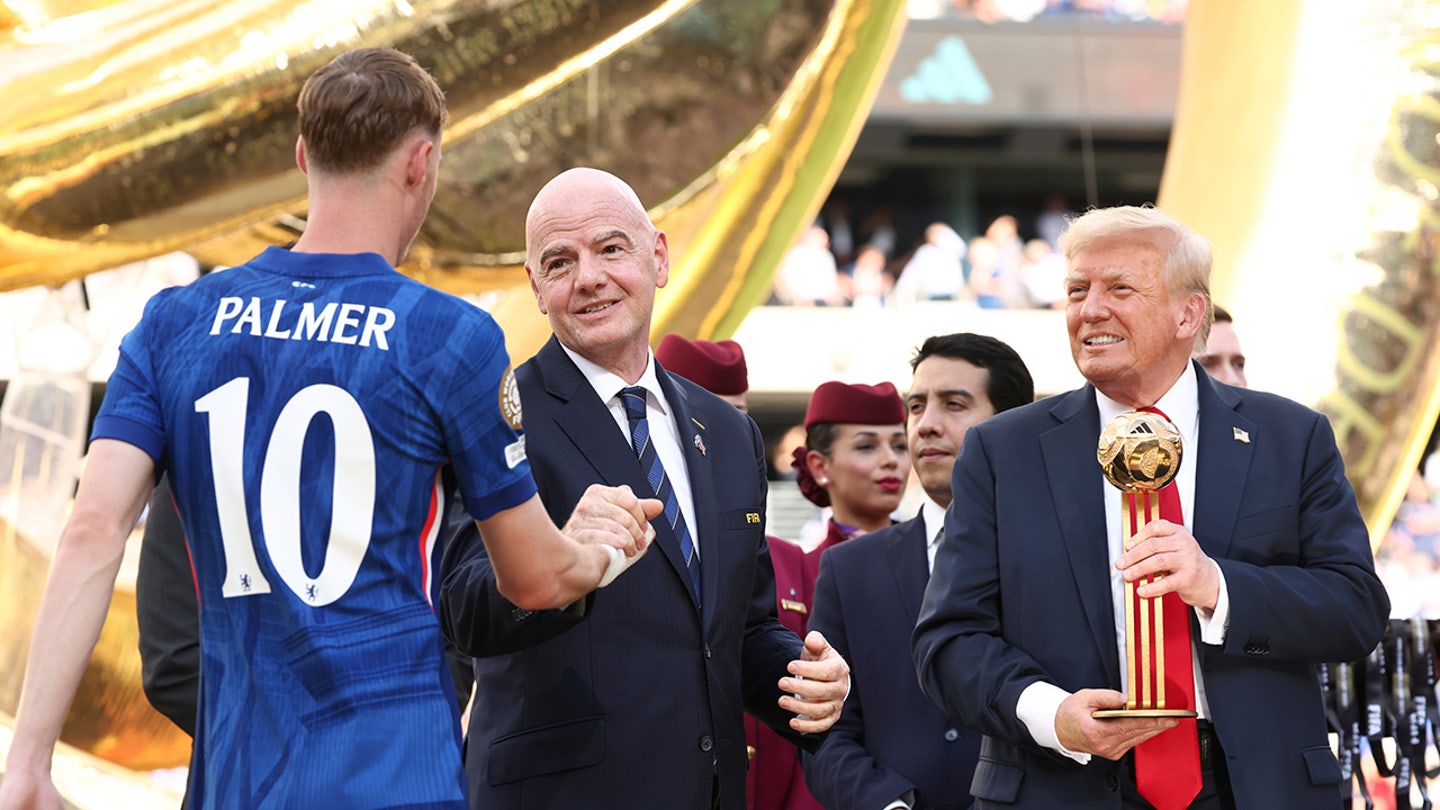 President Donald Trump and FIFA President Gianni Infantino present Chelsea’s Cole Palmer with Golden Ball Trophy after Chelsea won the Club World Cup final at Metlife Stadium, Sunday 13 July 2025. (Kevin Lamarque/Poolfoto via AP)