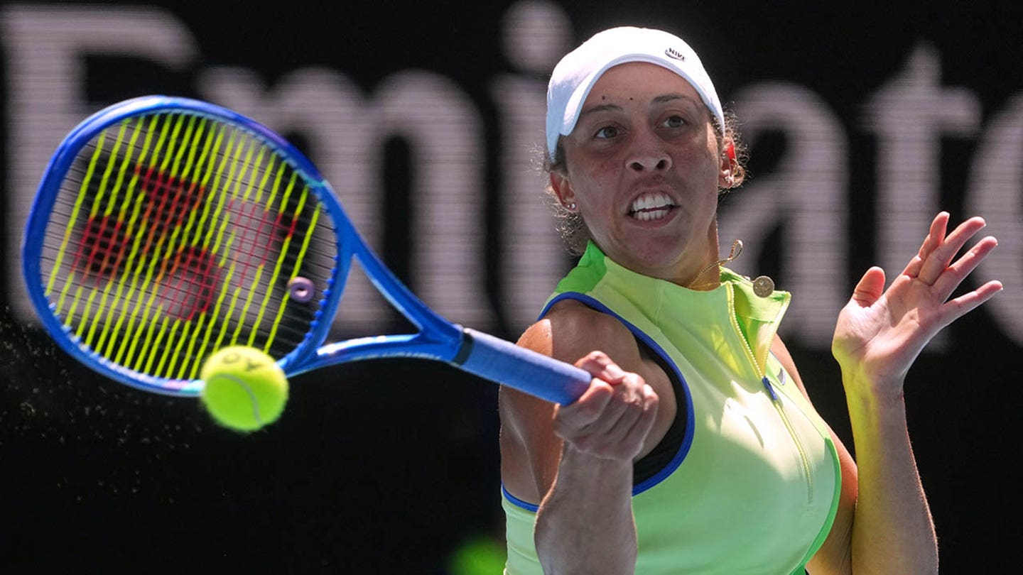 Madison Keys of the United States plays a forehand return to compatriot Ashlyn Krueger during their second round match at the Australian Open tennis championships in Melbourne, Australia, Thursday, Jan. 22, 2026. (AP Photo/Asanka Brendon Ratnayake)