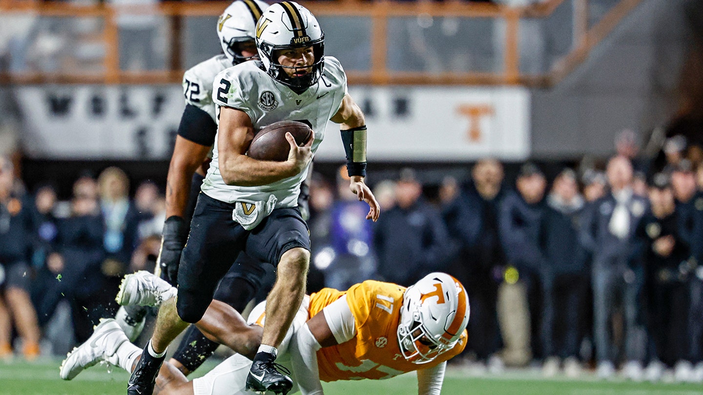 Vanderbilt quarterback Diego Pavia (2) runs for yardage as he eludes Tennessee defensive lineman Ethan Utley (17) during the second half of an NCAA college football game Saturday, Nov. 29, 2025, in Knoxville, Tennessee. (AP Photo/Wade Payne)