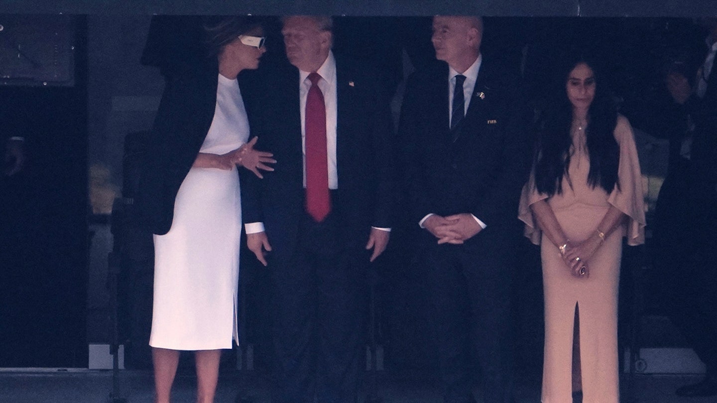 President Donald Trump talks to First Lady Melania Trump before the club World Cup final football match between Chelsea and PSG, Sunday 13 July 2025. (AP Photo/Matt Slocum)