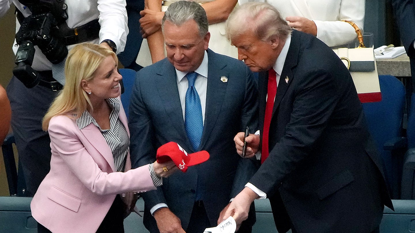 President Donald Trump, with US lawyer Pam Bondi (L) and US special envoy Steve Witkoff (C), signing hats on Billie Jean King National Tennis Center for the US Open Finals on September 7, 2025 in New York City. (Kevin Dietsch/Getty Images)
