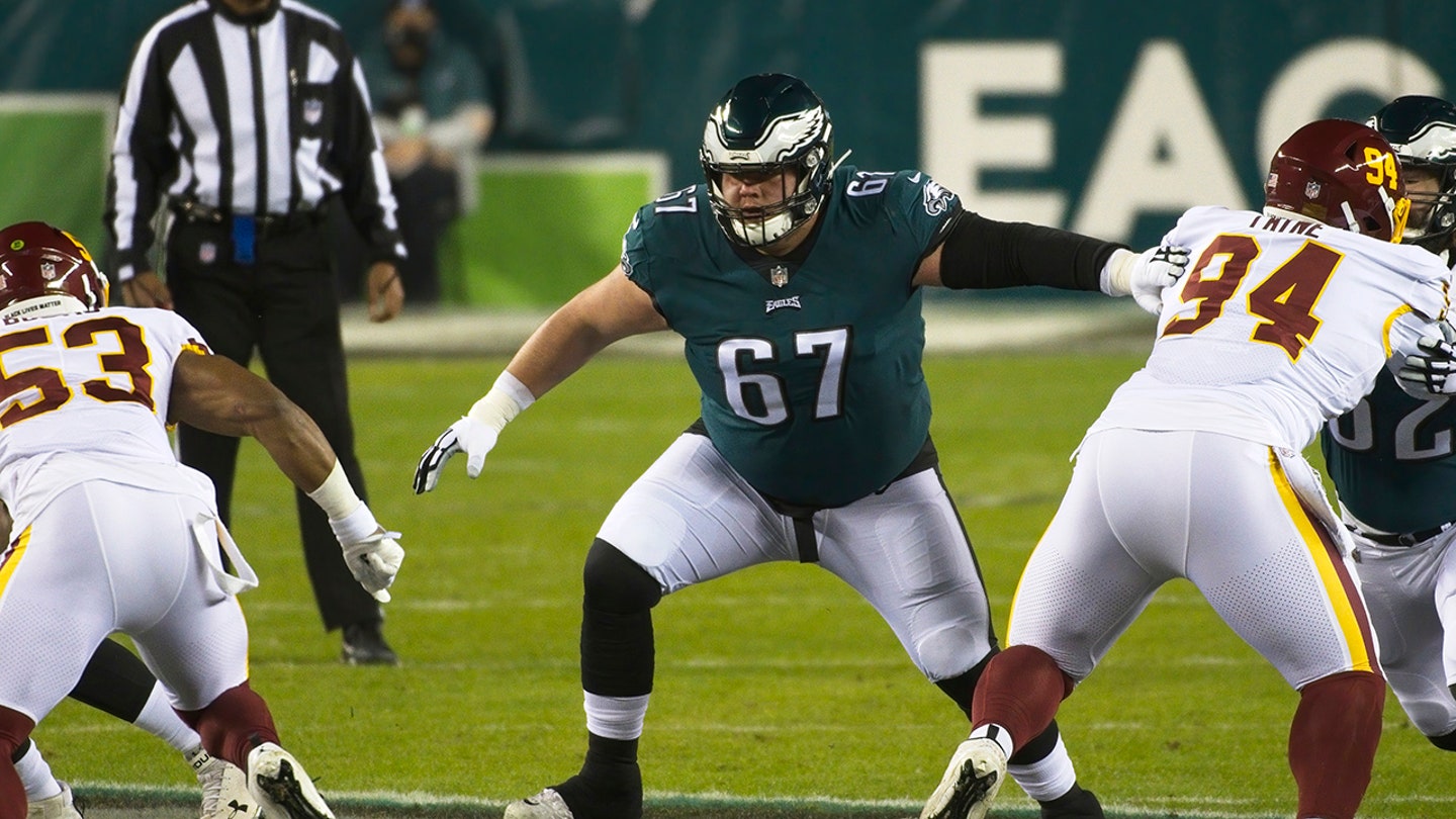 Philadelphia Eagles Offensive Guard Nate Herbig, #67, sets up to block during the game between Washington football team and Philadelphia Eagles on January 3, 2021 at Lincoln Financial Field in Philadelphia. (Andy Lewis/Icon Sportswire via Getty Images)