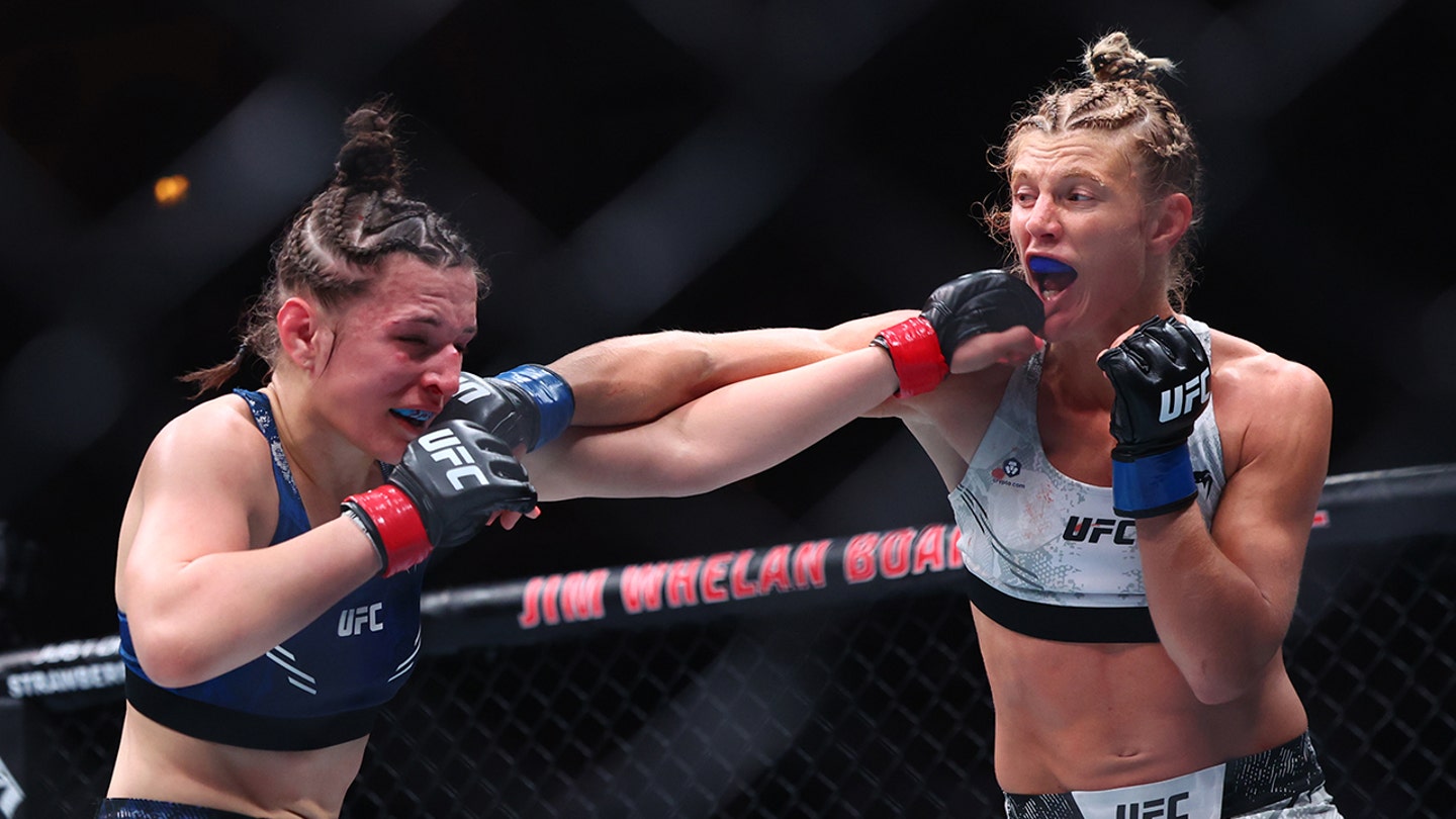 Erin Blanchfield, left, fighting Manon Fiorot during UFC Fight Night in Boardwalk Hall in Atlantic City, New Jersey, March 30, 2024. (ED Mulholland -usa Today Sports)