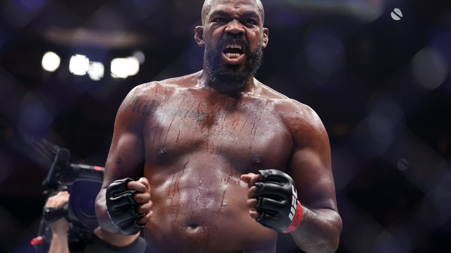 Jon Jones responds to his TKO victory against Stip Miocic in a UFC Heavyweight Championship match under the UFC 309 at Madison Square Garden 16 November 2024 in New York City. (Sarah Stier/Getty Images)