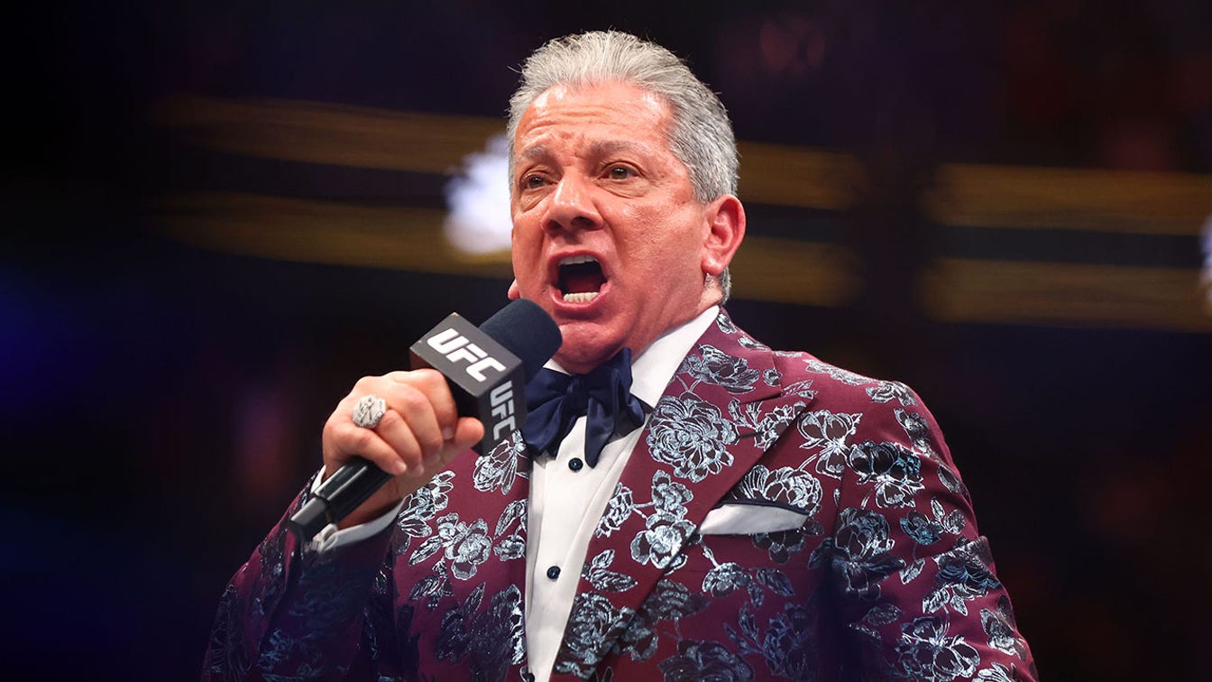 UFC announcer Bruce Buffer stands before the fight between Jiri Prochazka and Carlos Ulberg during UFC 327 at the Kaseya Center in Miami, Florida on April 11, 2026. (Sam Navarro/Imagn Images)