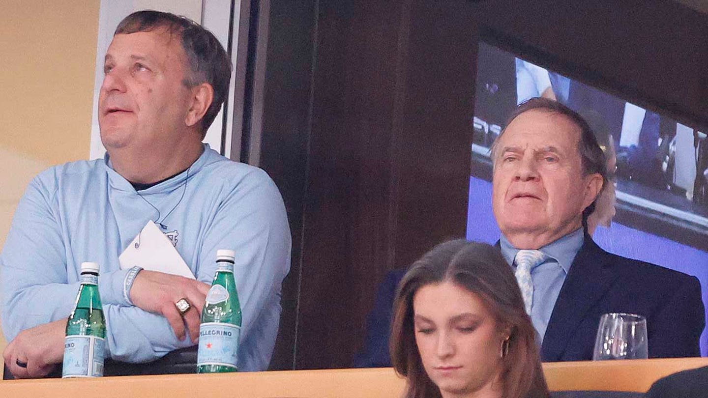 Main football coach Bill Belichick of North Carolina Tar Heels with General Manager Michael Lombardi in the second half between Chicago Bulls and Denver Nuggets in United Center 27 January 2025 in Chicago. (Michael Reaves/Getty Images)