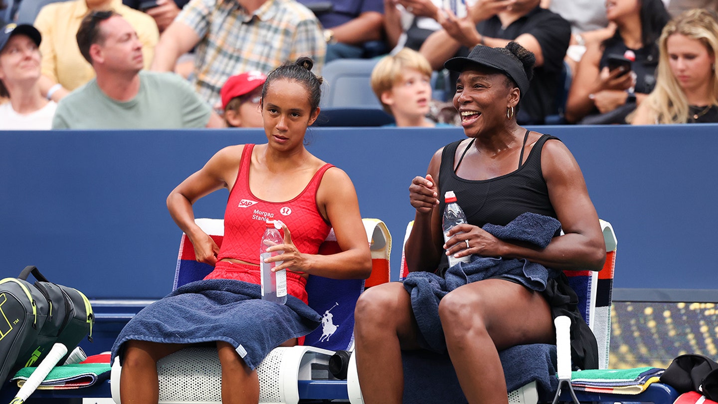 Venus Williams of the United States and Leylah Fernandez from Canada speak during their women’s double quarter -final fight against Katerina Siniakova from the Czech Republic and Taylor Townsend in the United States on day ten in 2025 the US Open. (Al Bello/Getty Images)