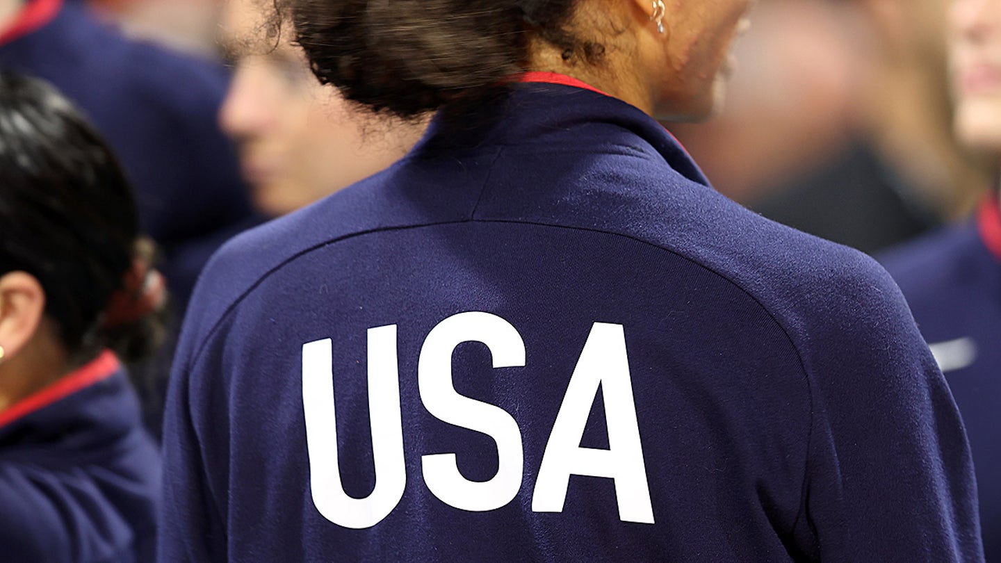 A US volleyball player carries a team jacket during an Olympic volleyball finalizing celebration after a US -Holland women’s match as part of the 2024 US Volleyball Cup presented by Hoag by Walter Pyramid on July 14, 2024 in Long Beach, California. (Kaelin Mendez/Getty Images)