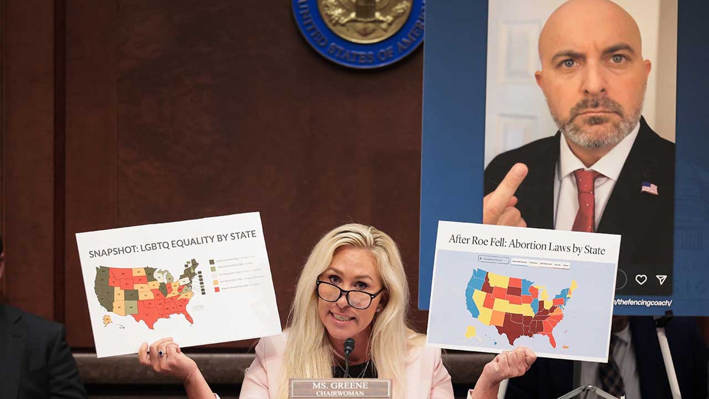 Rep. Marjorie Taylor Greene, R-Ga., holds up a map of the United States in front of an alleged screenshot from USA Fencing board director Damien Lehfeldt’s Instagram during the hearing on “Unfair Play: Keeping Men Out of Women’s Sports” held by the Department of Government Efficiency (DOGE) Subcommittee at the US Capitol, 02 May 07, Washington, DC. (Kayla Bartkowski/Getty Images)